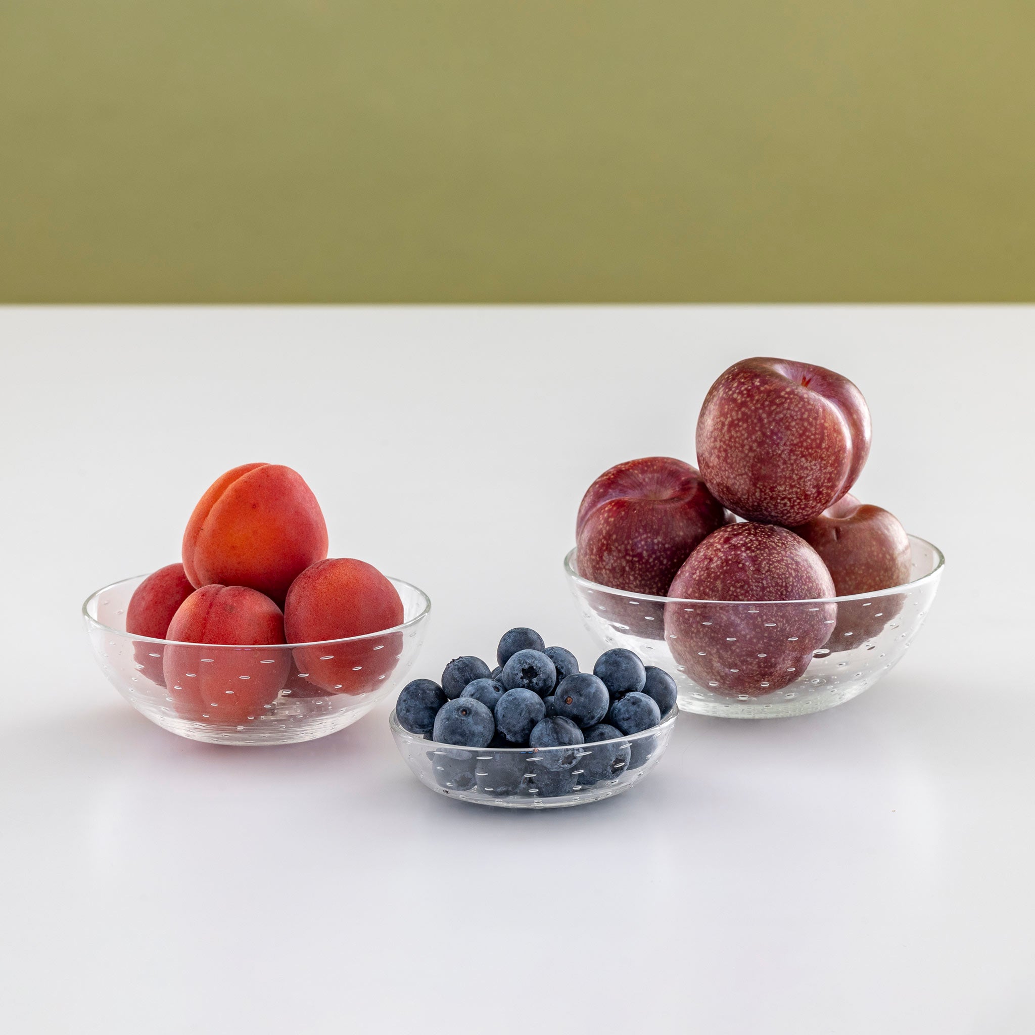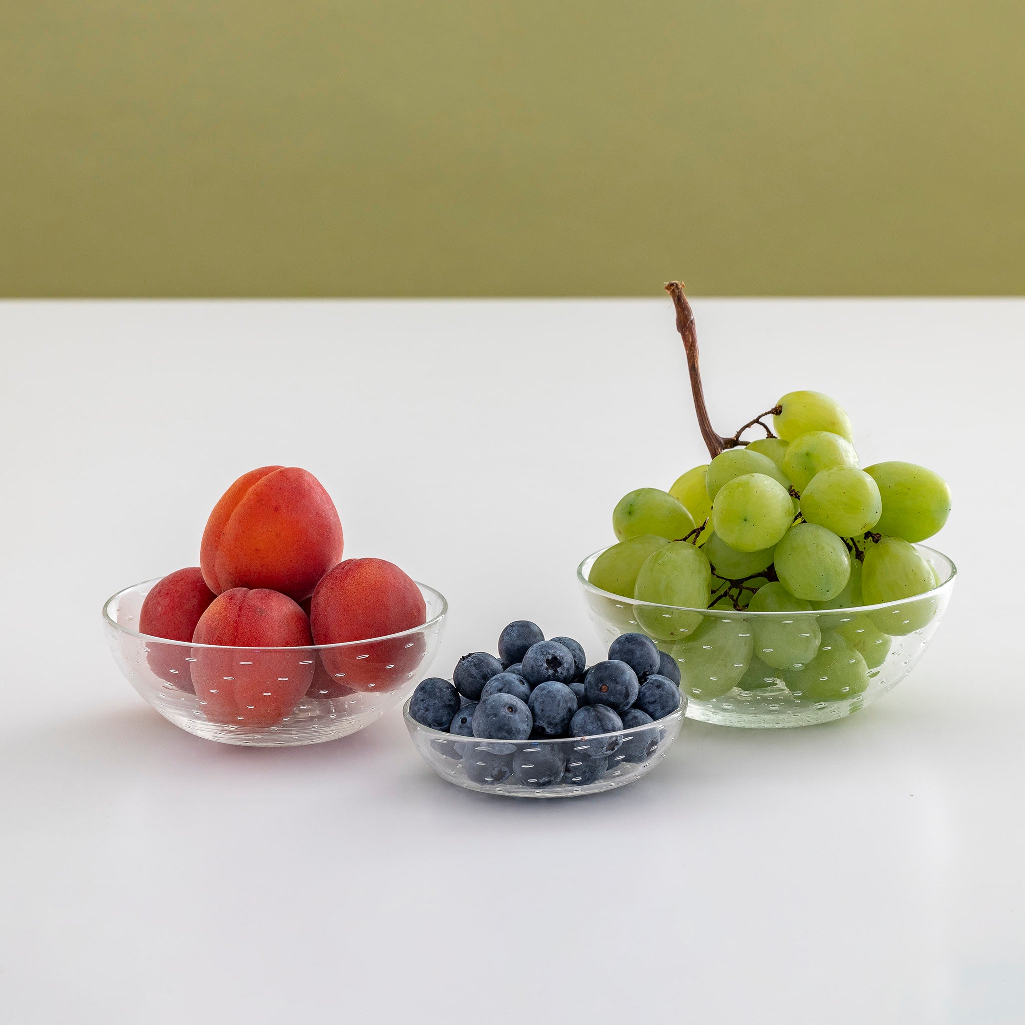 Inspired by the graceful image of raindrops on a windowpane, the Rain Collection evokes a sense of quiet beauty and calm. Each piece expresses serenity through its minimalist form and Japanese aesthetic of simplicity and restraint. Created to complement both contemporary and traditional settings, the collection brings a lightness and poetry to the table. Designed by Felicity Menadue, the collection is mouthblown in Murano by a master glassblower utilising the historic bullicante technique. Developed in Murano in the 1930s, this distinctive effect is achieved through a skilled and meticulous process that results in a captivating pattern of delicate air bubbles trapped within the glass.