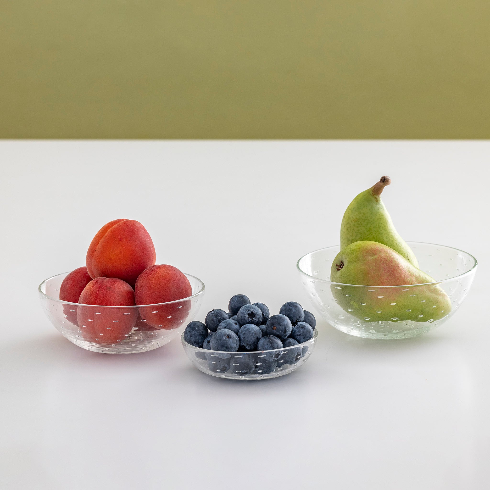 Inspired by the graceful image of raindrops on a windowpane, the Rain Collection evokes a sense of quiet beauty and calm. Each piece expresses serenity through its minimalist form and Japanese aesthetic of simplicity and restraint. Created to complement both contemporary and traditional settings, the collection brings a lightness and poetry to the table. Designed by Felicity Menadue, the collection is mouthblown in Murano by a master glassblower utilising the historic bullicante technique. Developed in Murano in the 1930s, this distinctive effect is achieved through a skilled and meticulous process that results in a captivating pattern of delicate air bubbles trapped within the glass.